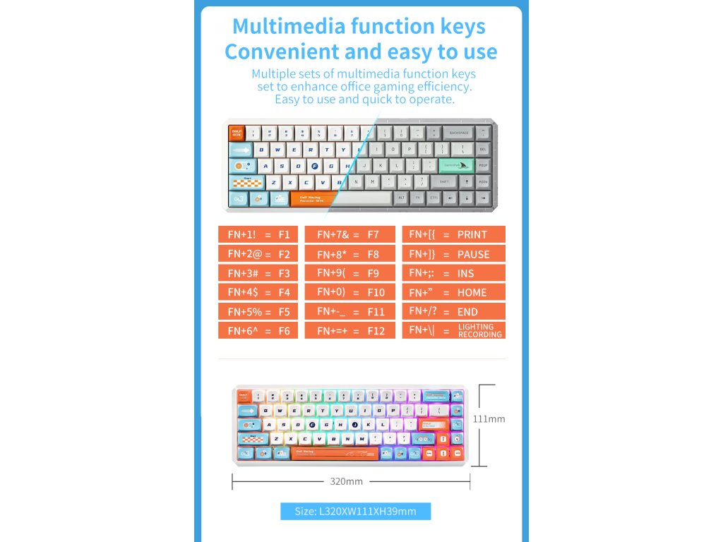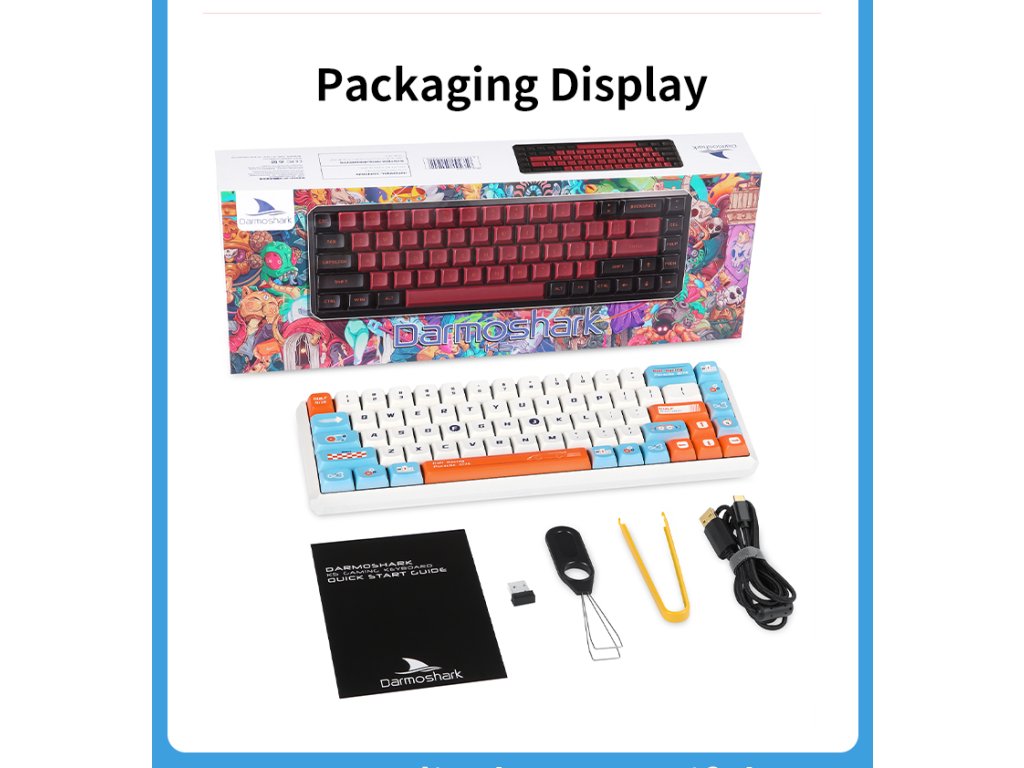 Darmoshark K5 je kompaktná mechanická klávesnica so 68 klávesmi (80 % rozloženie), ktorá šetrí miesto na stole, no zároveň ponecháva praktické funkcie cez FN skratky. Je vhodná na každodenné písanie aj hranie, pričom kombinuje bezdrôtové používanie s možnosťou klasického káblového pripojenia.