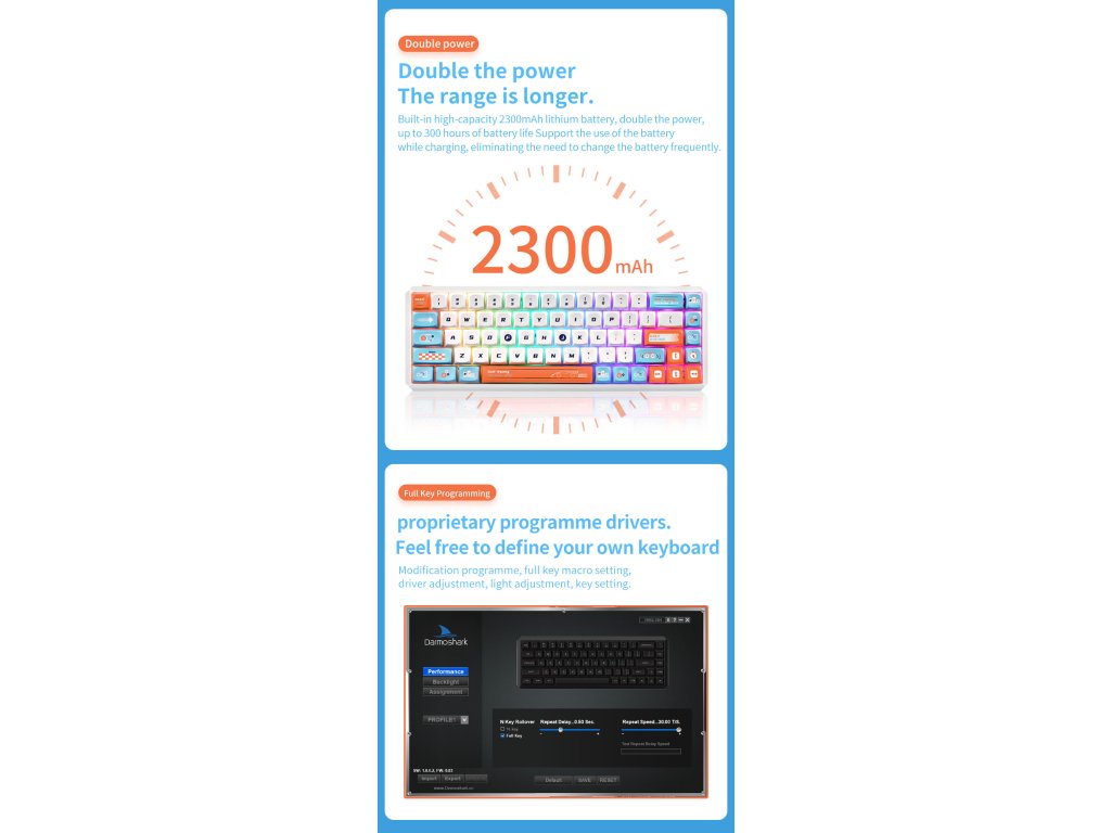 Batéria s kapacitou 2300 mAh je určená na dlhé používanie bez častého nabíjania (na produktových materiáloch sa uvádza výdrž až do približne 300 hodín v závislosti od režimu a používania). K dispozícii je aj softvér na programovanie klávesov a makier.