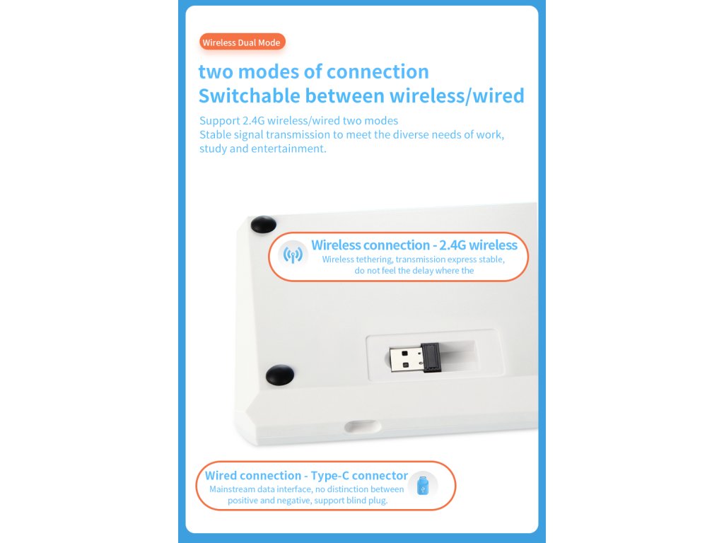 Klávesnica podporuje dve možnosti pripojenia: bezdrôtovo cez 2.4G (USB prijímač) a káblovo cez USB-C (Type-C). Odpojiteľný kábel uľahčuje prenášanie a skladovanie a zároveň vieš klávesnicu používať aj počas nabíjania.