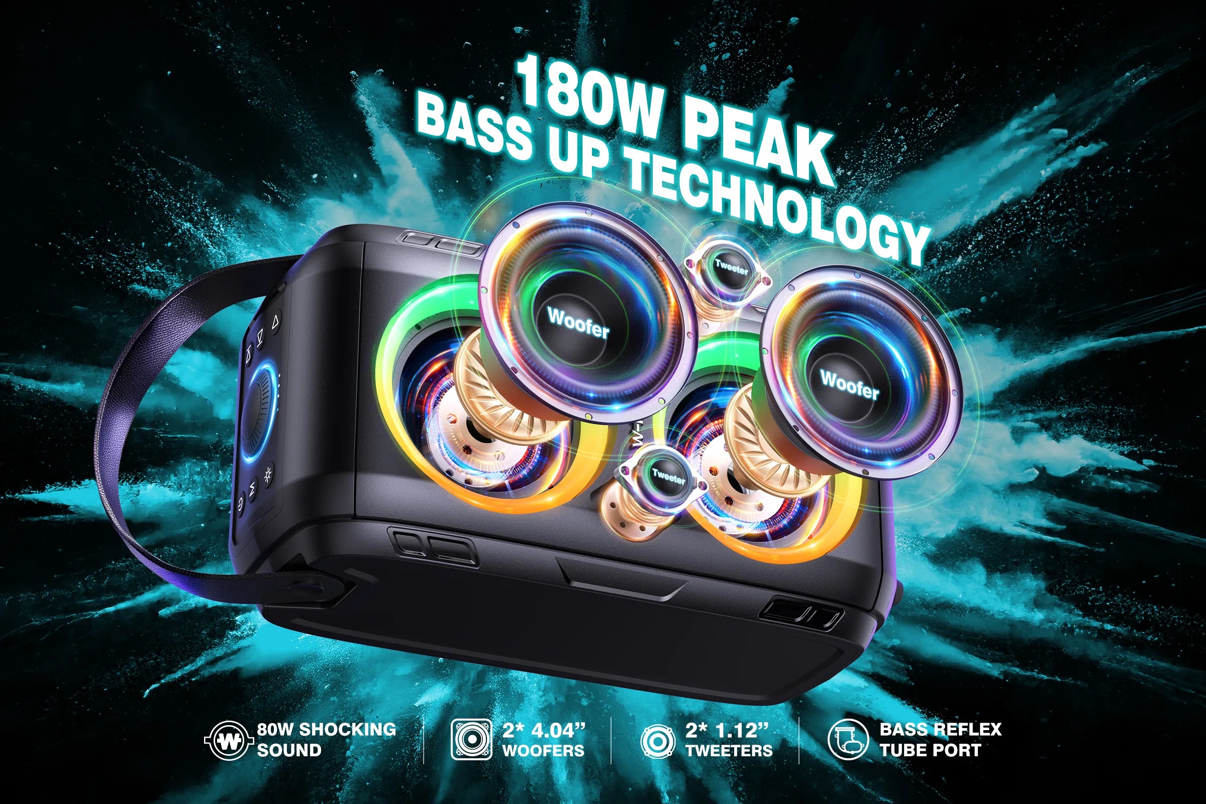 Zažite hromový zvuk štúdiovej kvality so špičkovým výkonom 180 W (80 W RMS). Vďaka dvom 4,04" basovým reproduktorom, dvom 1,12" výškovým reproduktorom a špeciálnemu basreflexovému portu poskytuje T9 hlboké, dunivé basy a čisté výšky bez skreslenia pre pohlcujúci posluchový zážitok.