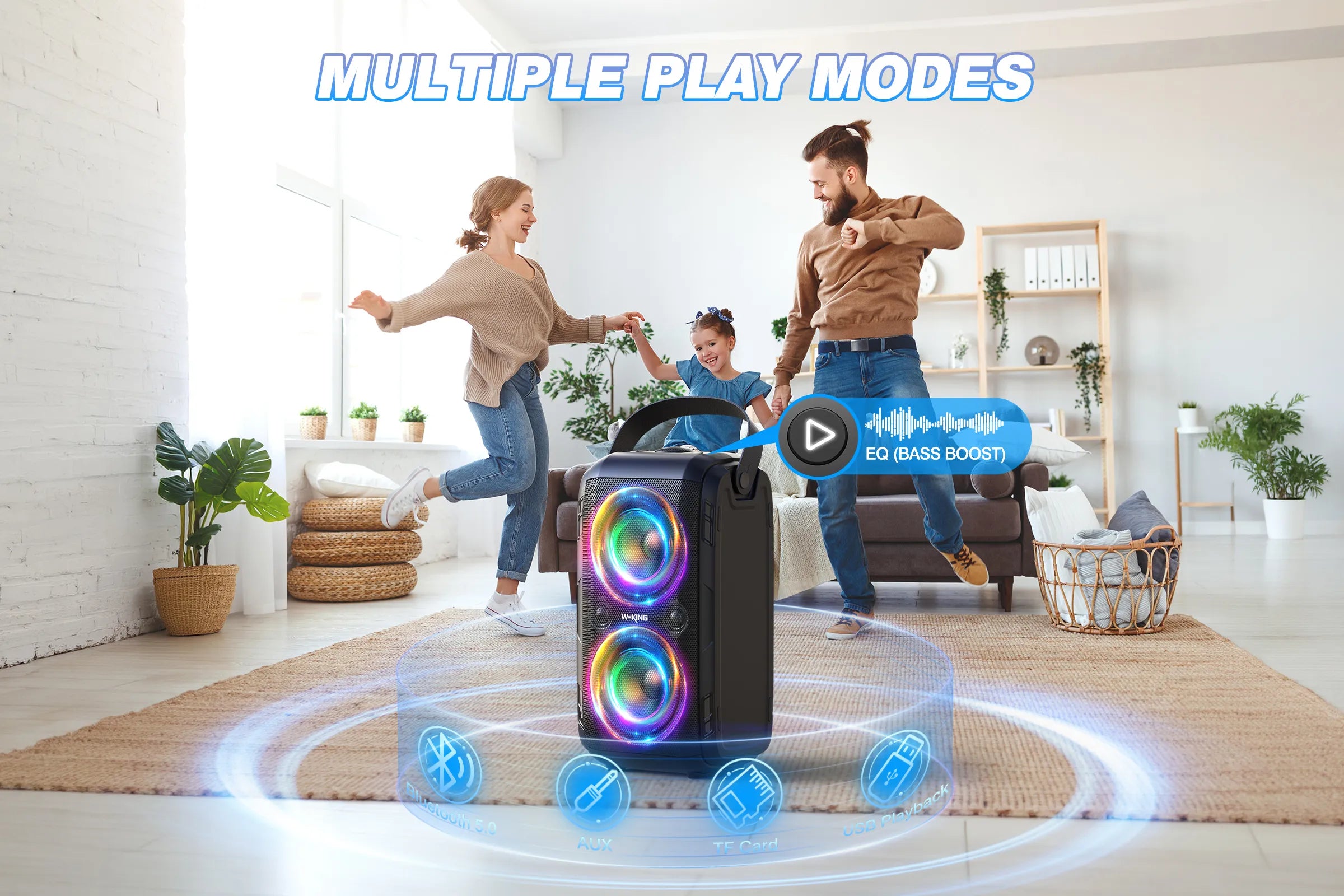 Vychutnajte si maximálnu flexibilitu s prehrávaním cez Bluetooth 5.0, AUX, TF kartu a USB, plus špeciálny režim ekvalizéra (zvýraznenie basov) na prispôsobenie zvuku. W-KING T9 sa bez problémov hodí na rodinné filmové večery, tanečné párty a každodenné počúvanie.